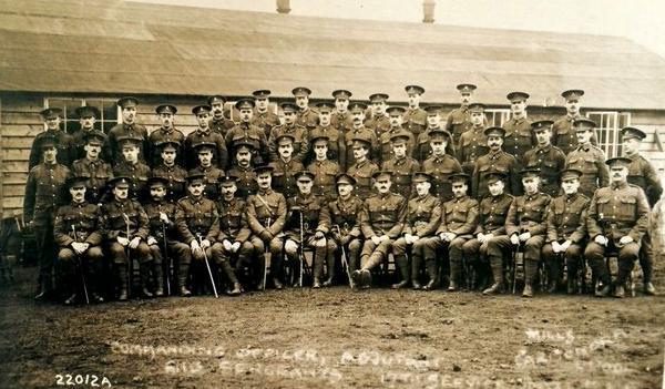 U112 20th Battalion, King’s Liverpool Regiment, 4th Pals, commanding officer, adjutant and sergeants. Courtesy of Angela Collinson.