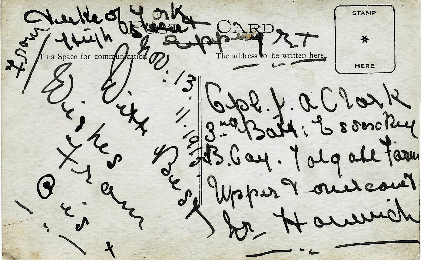 F321 Corporal J.A. Clark, B Company, 3rd Battalion, Essex Regiment, and ladies, Upper Dovercourt, Harwich, 13 November 1915, posted by ‘Cis’ from Duke of York, High Street, Epping.