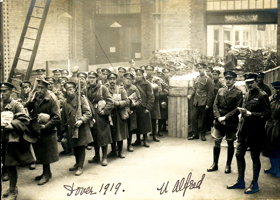 U120 Various units returning, Dover, 1919, Lieutenant Alfred Farnan, 2nd Battalion, King’s Royal Rifle Corps, standing right. Courtesy of Barry Spears.