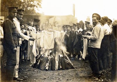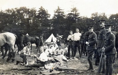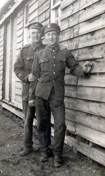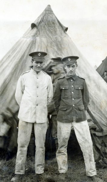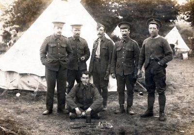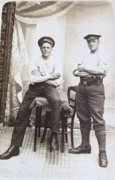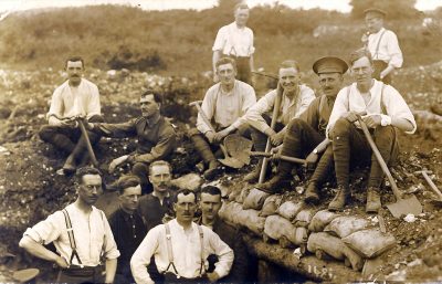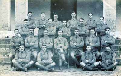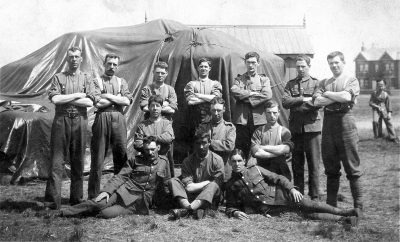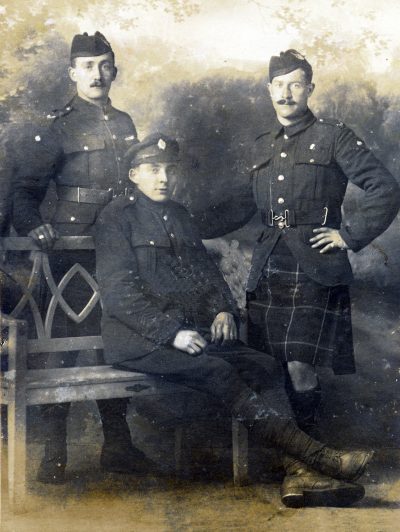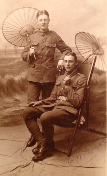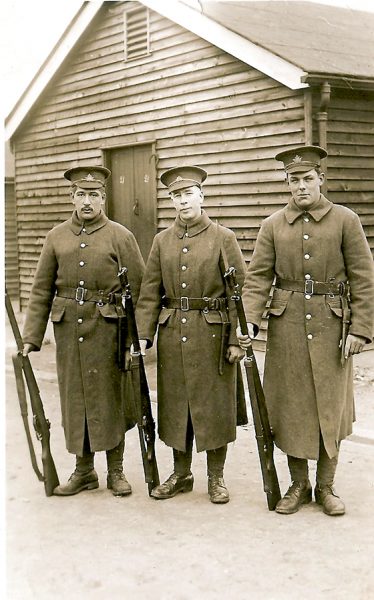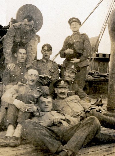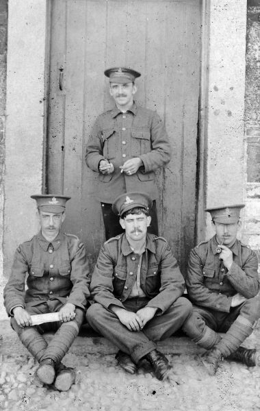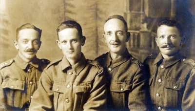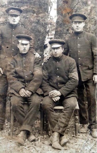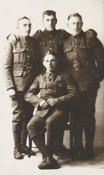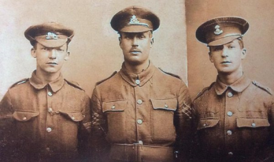 Sidney Hibbert (centre), 5th Battalion South Staffordhsire Regiment, killed 1 July 1916, and pals. Courtesy of Paul Hughes.